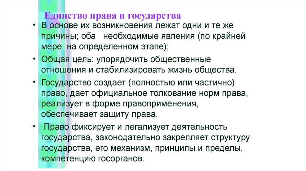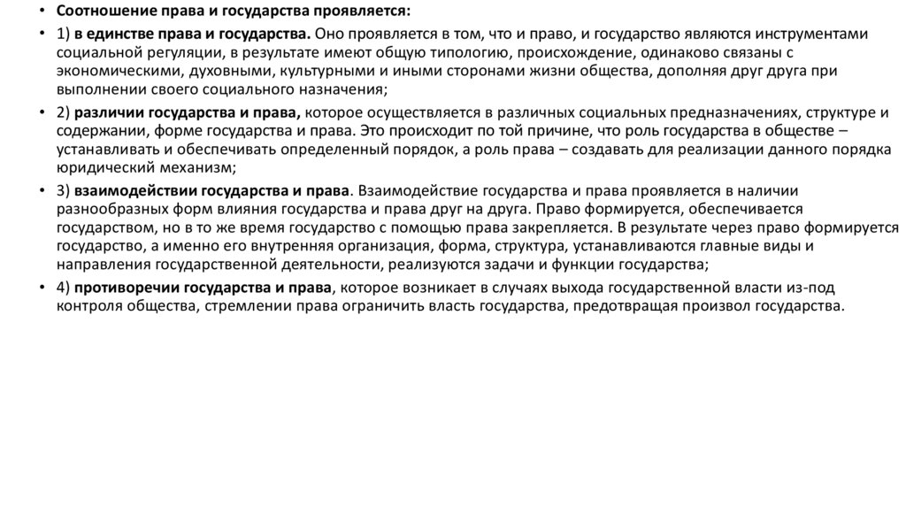 • Соотношение права и государства проявляется:• 1) в единстве права и государства. Оно проявляется в том, что и право, и государство являются инструментами