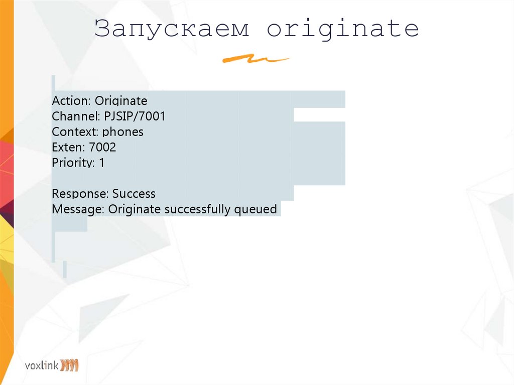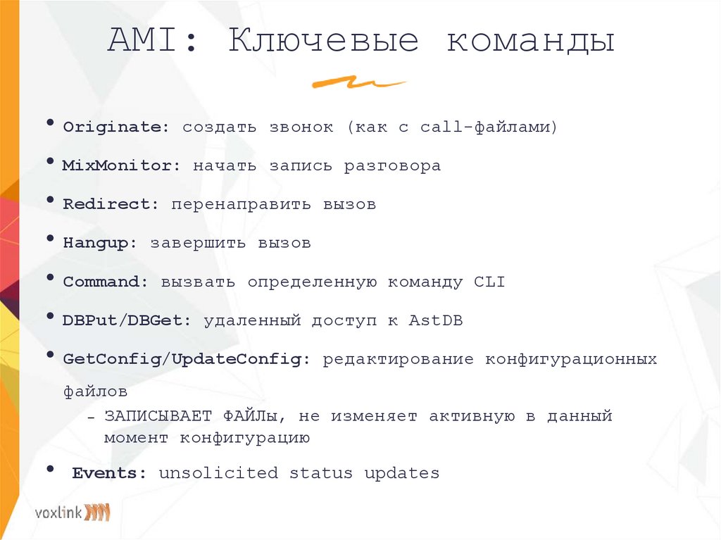 AMI: Ключевые команды• Originate: создать звонок (как с call-файлами)
