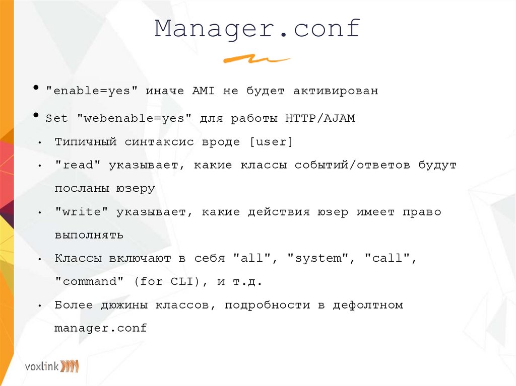 Manager.conf• "enable=yes" иначе AMI не будет активирован