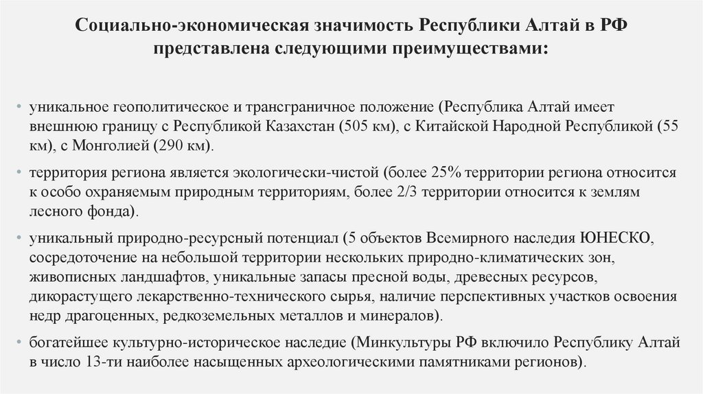 Социально-экономическая значимость Республики Алтай в РФпредставлена следующими преимуществами: