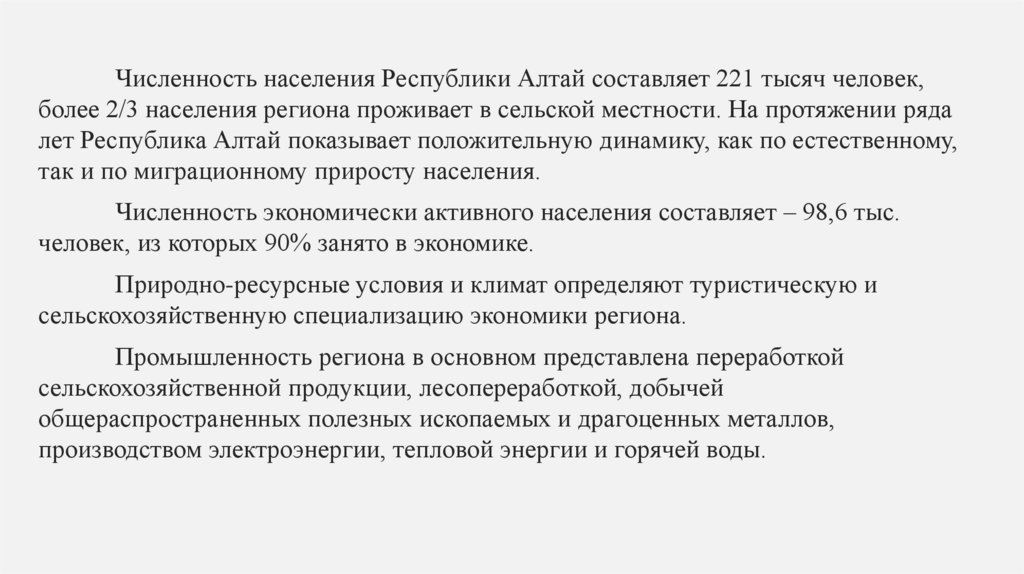 Численность населения Республики Алтай составляет 221 тысяч человек,более 2/3 населения региона проживает в сельской местности. На протяжении ряда