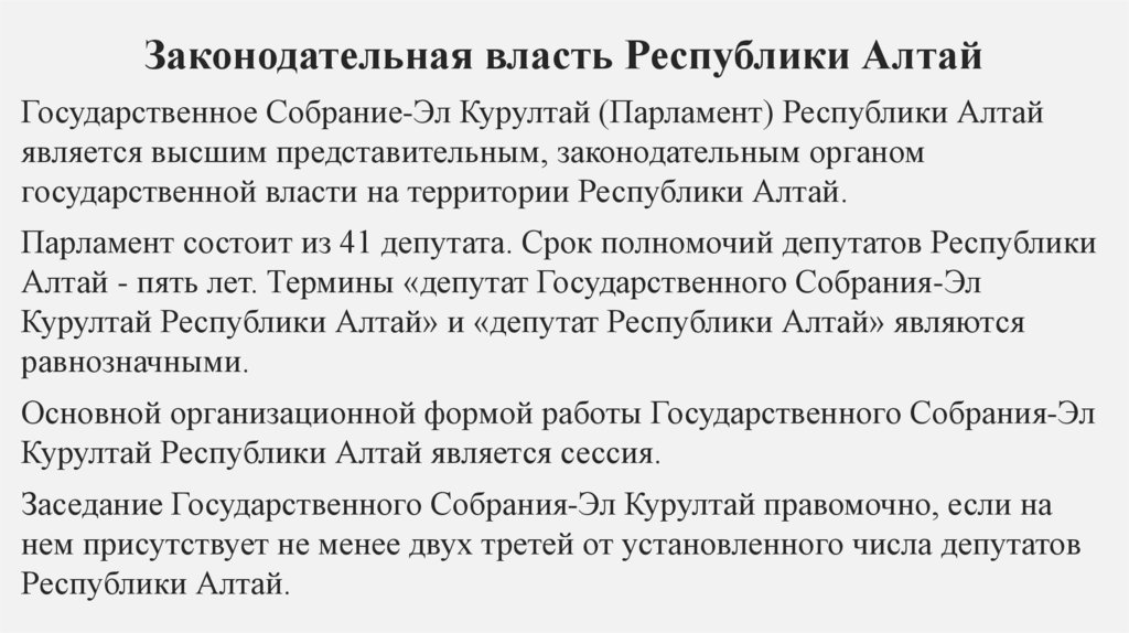 Законодательная власть Республики АлтайГосударственное Собрание-Эл Курултай (Парламент) Республики Алтай