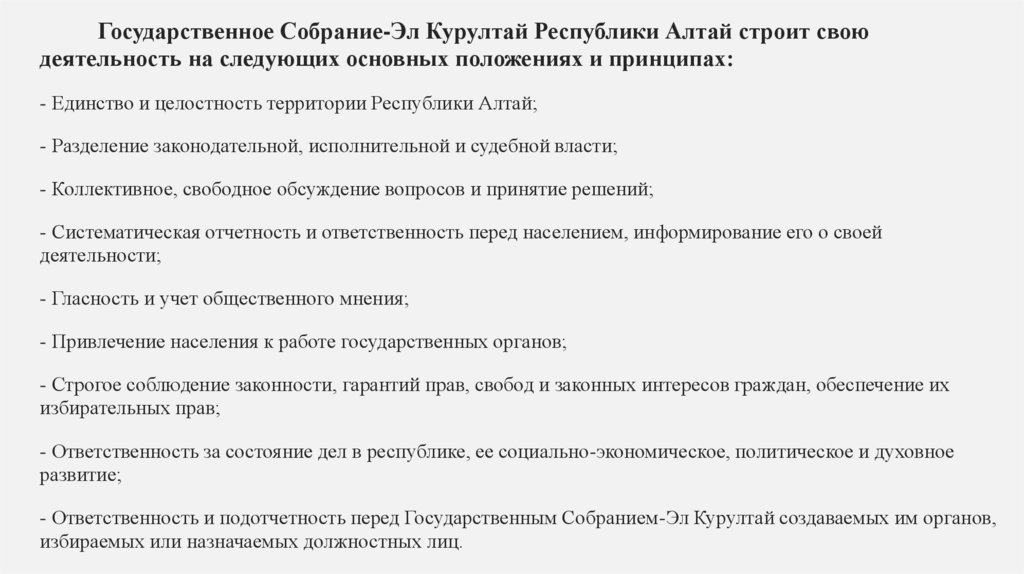 Государственное Собрание-Эл Курултай Республики Алтай строит своюдеятельность на следующих основных положениях и принципах: