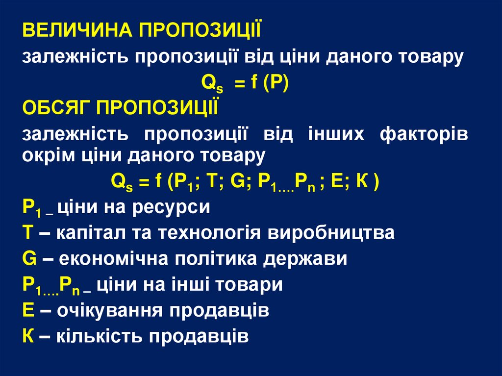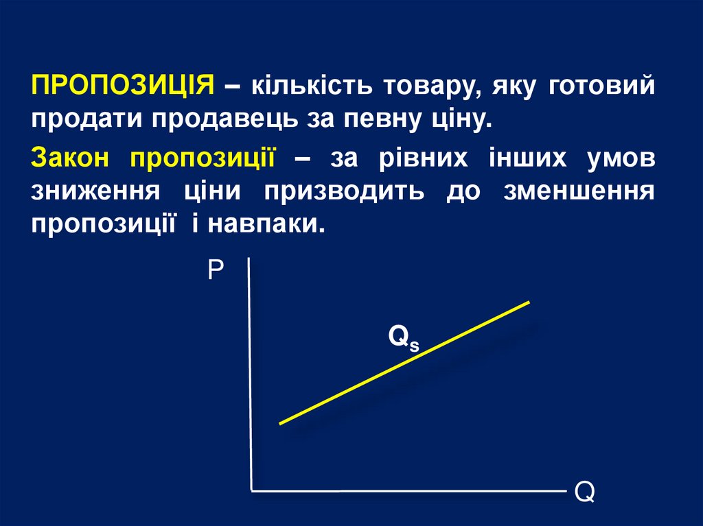 ПРОПОЗИЦІЯ – кількість товару, яку готовийпродати продавець за певну ціну.