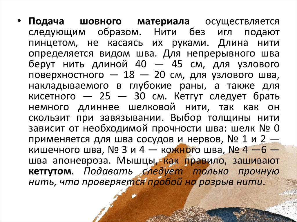 • Подача шовного материала осуществляетсяследующим образом. Нити без игл подают