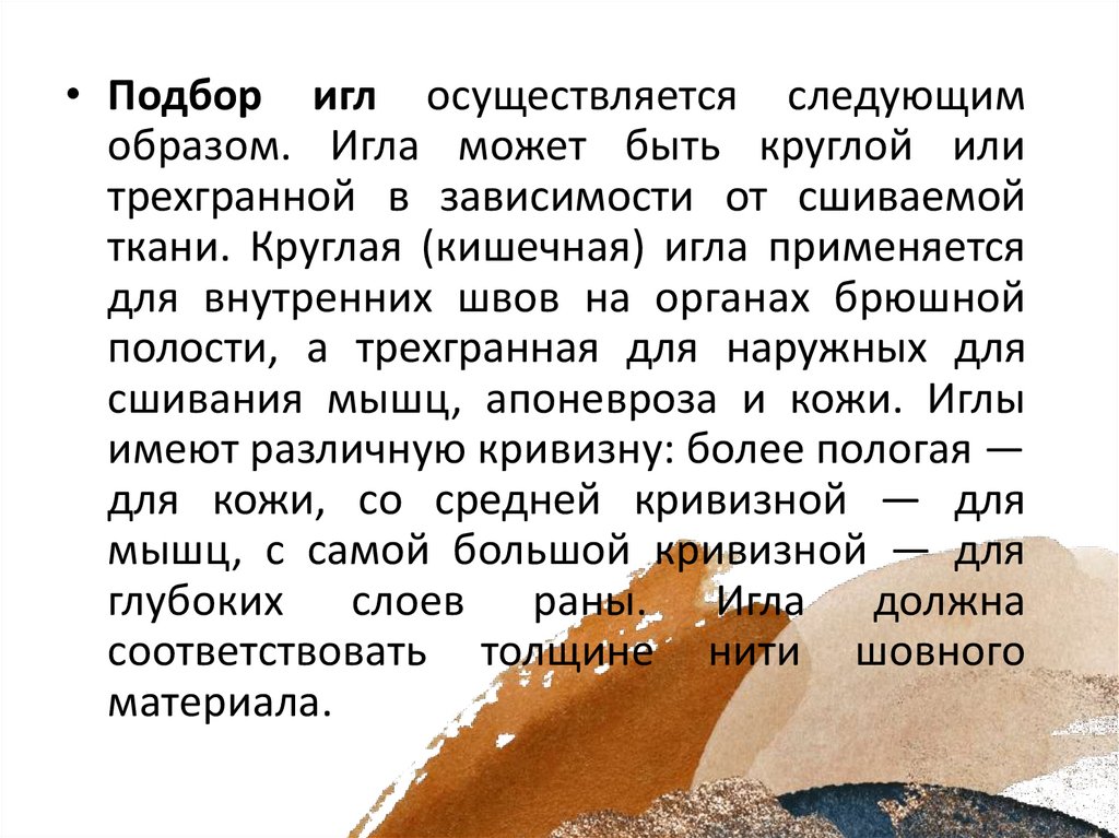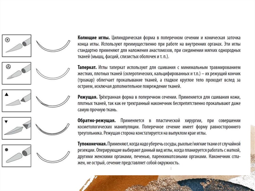 • Подбор игл осуществляется следующимобразом. Игла может быть круглой или