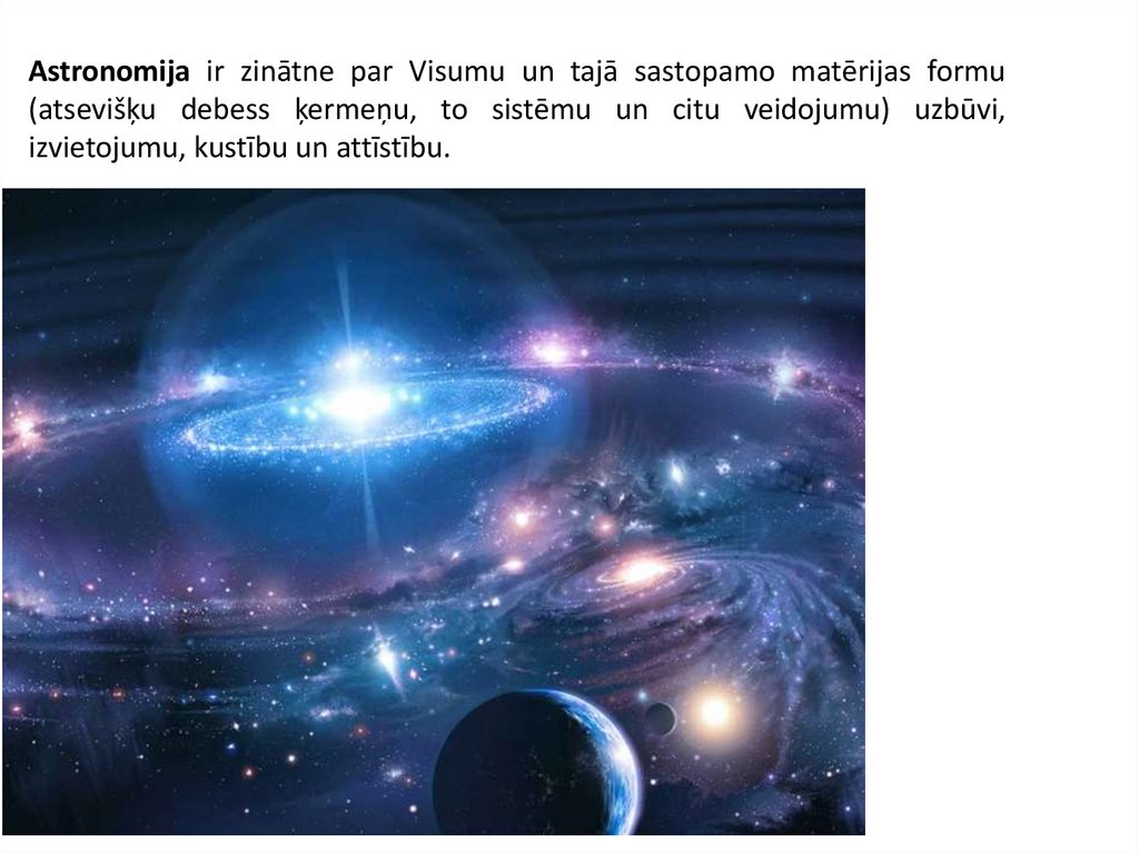 Astronomija ir zinātne par Visumu un tajā sastopamo matērijas formu(atsevišķu debess ķermeņu, to sistēmu un citu veidojumu) uzbūvi,