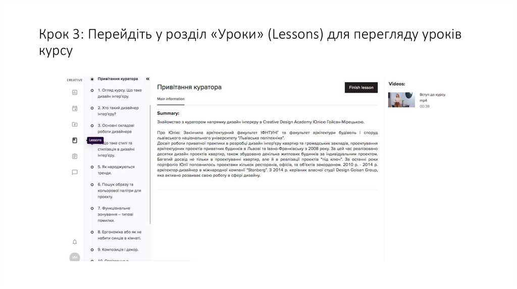 Крок 3: Перейдіть у розділ «Уроки» (Lessons) для перегляду уроківкурсу