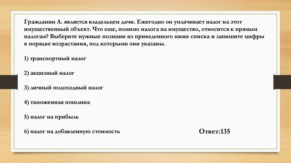 Гражданин А. является владельцем дачи. Ежегодно он уплачивает налог на этотимущественный объект. Что еще, помимо налога на имущество, относится к прямым