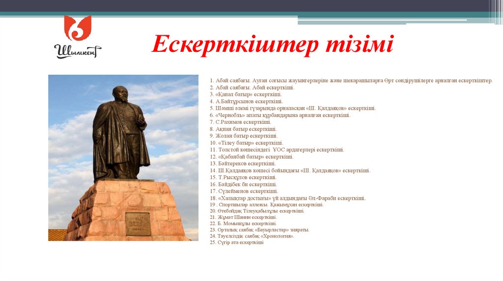Ескерткіштер тізімі1. Абай саябағы. Ауған соғысы жауынгерлеріне және шекарашыларға Өрт сөндірушілерге арналған ескерткіштер.