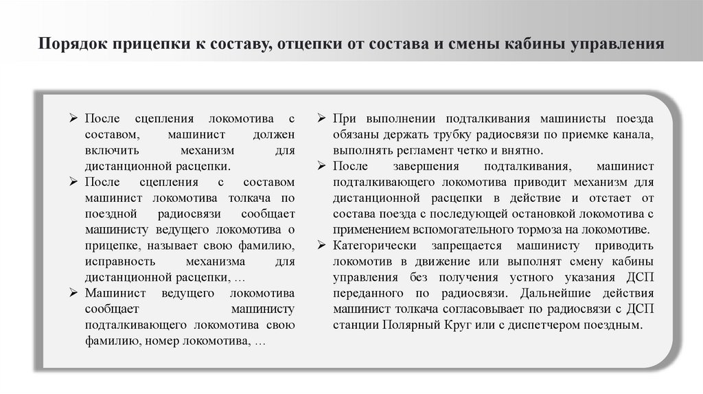 Порядок прицепки к составу, отцепки от состава и смены кабины управленияПосле сцепления локомотива с