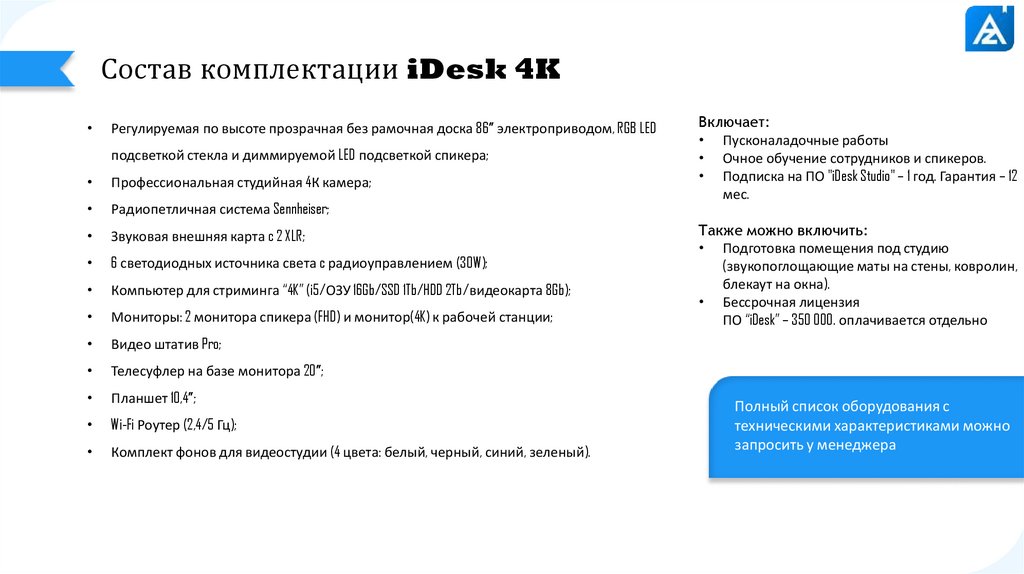 • Подписка на ПО "iDesk Studio" – 1 год. Гарантия – 12