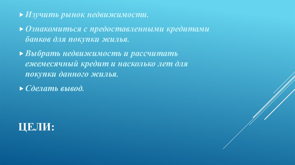 Изучить рынок недвижимости.Ознакомиться с предоставленными кредитами