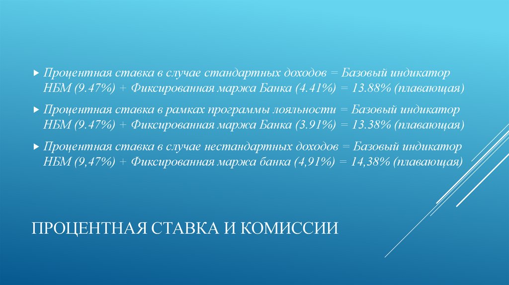 Процентная ставка в случае стандартных доходов = Базовый индикаторНБМ (9.47%) + Фиксированная маржа Банка (4.41%) = 13.88% (плавающая)