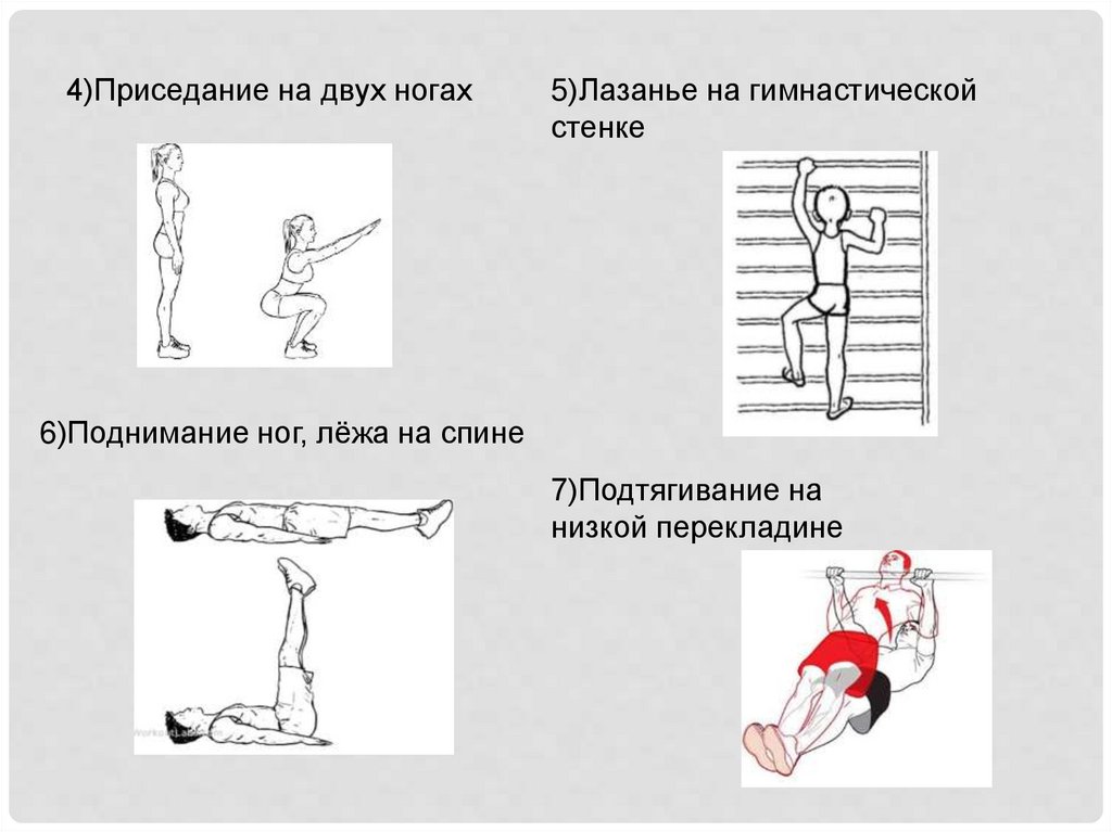 4)Приседание на двух ногах5)Лазанье на гимнастической