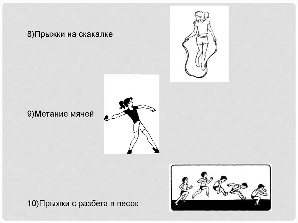 8)Прыжки на скакалке9)Метание мячей