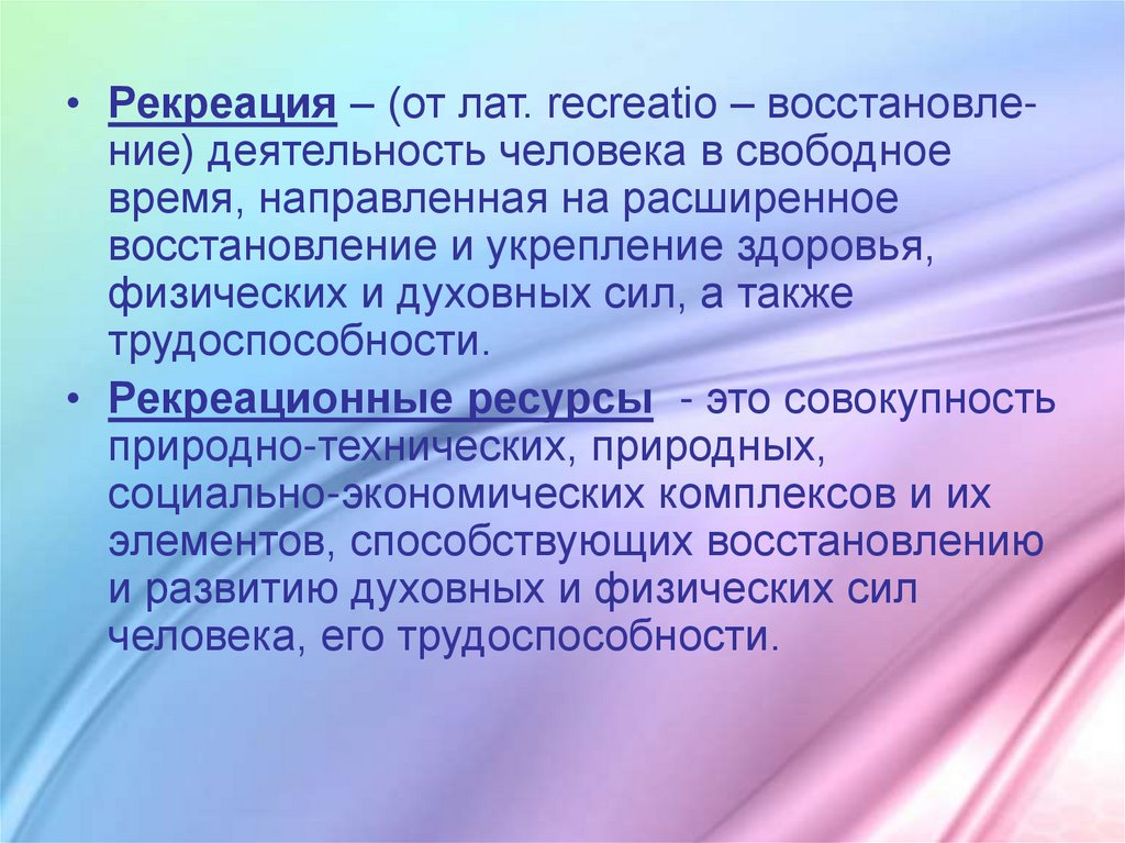 • Рекреация – (от лат. recreatio – восстановление) деятельность человека в свободноевремя, направленная на расширенное