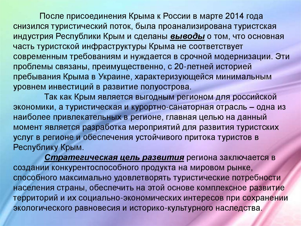После присоединения Крыма к России в марте 2014 годаснизился туристический поток, была проанализирована туристская