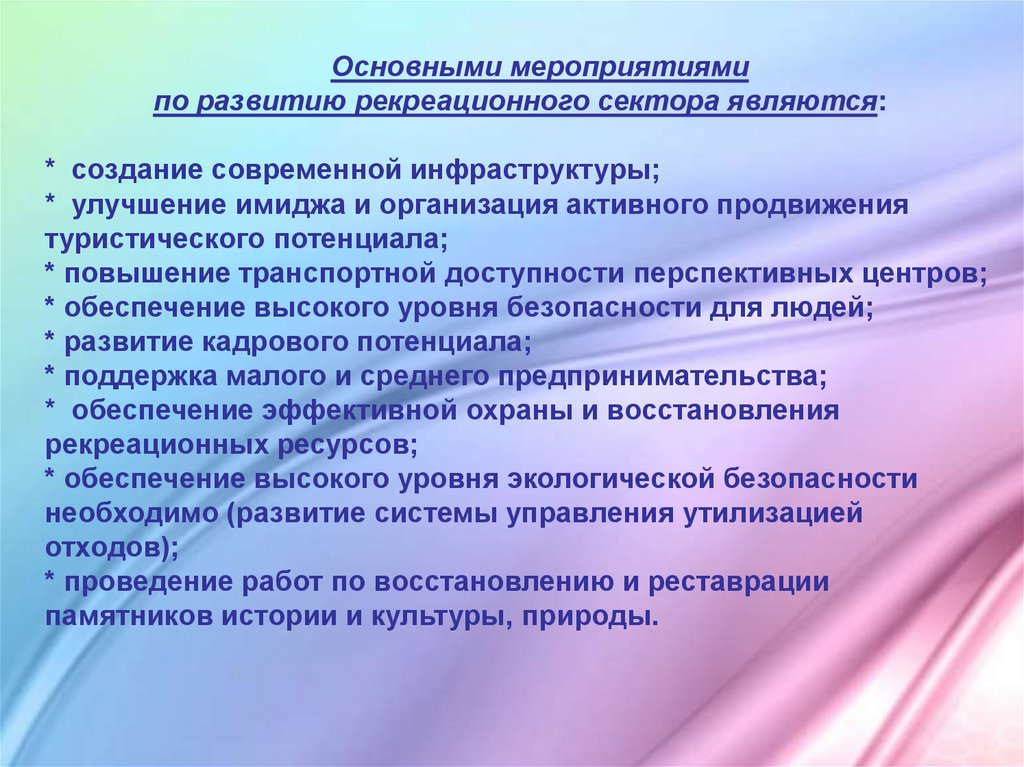 Основными мероприятиямипо развитию рекреационного сектора являются: