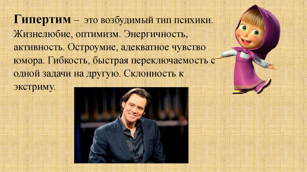 Гипертим – это возбудимый тип психики.Жизнелюбие, оптимизм. Энергичность,
