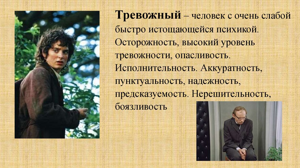 Тревожный – человек с очень слабойбыстро истощающейся психикой.