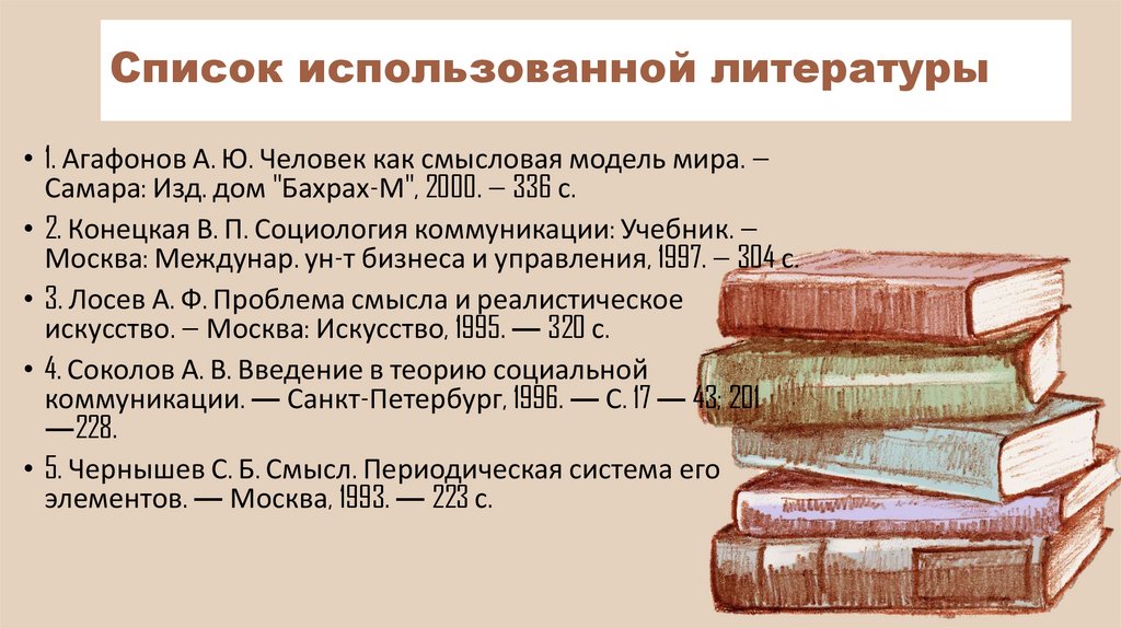 Список использованной литературы• 1. Агафонов А. Ю. Человек как смысловая модель мира. —