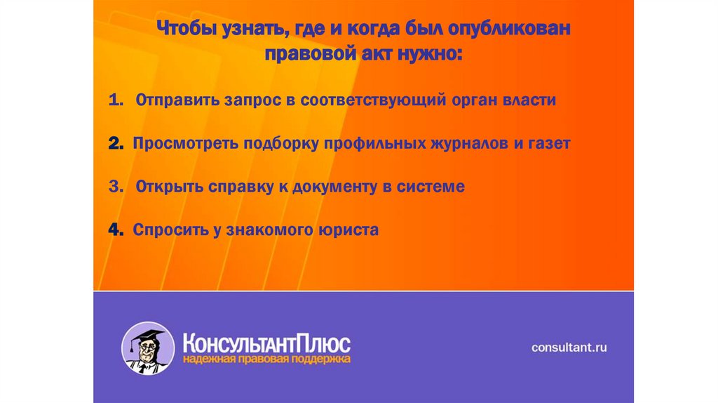Чтобы узнать, где и когда был опубликованправовой акт нужно: