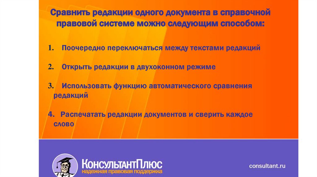 Сравнить редакции одного документа в справочнойправовой системе можно следующим способом: