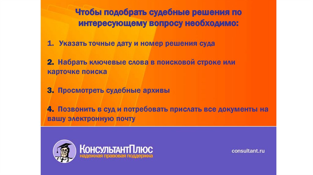 Чтобы подобрать судебные решения поинтересующему вопросу необходимо: