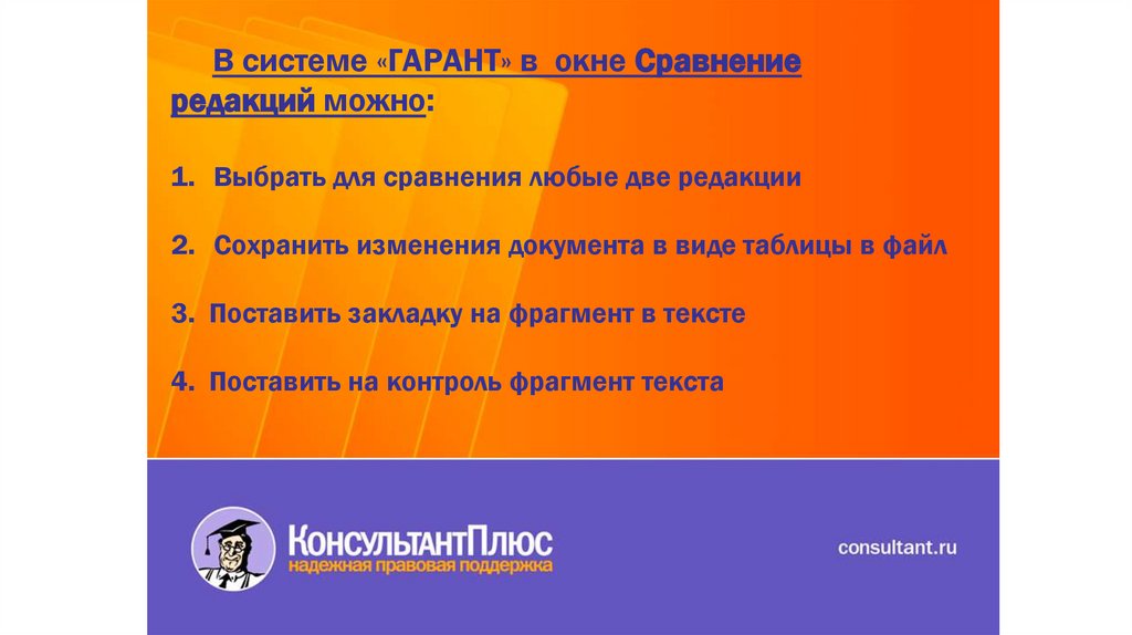 В системе «ГАРАНТ» в окне Сравнениередакций можно: