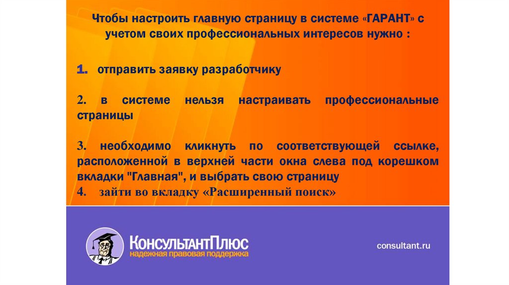 Чтобы настроить главную страницу в системе «ГАРАНТ» сучетом своих профессиональных интересов нужно :