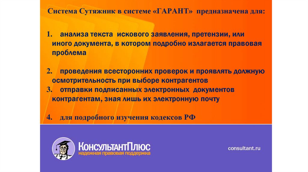 Система Сутяжник в системе «ГАРАНТ» предназначена для:1. анализа текста искового заявления, претензии, или