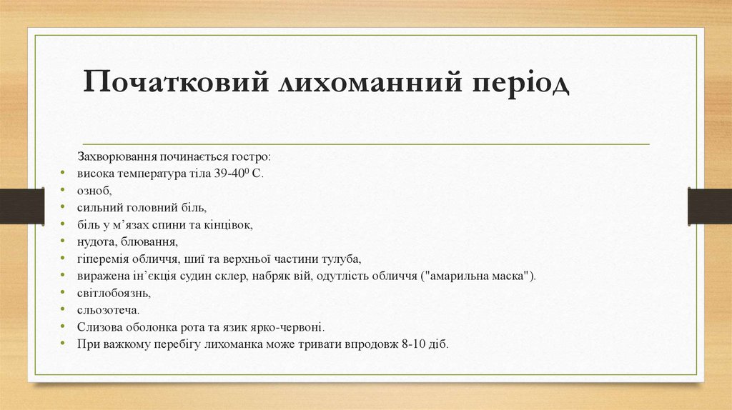 Початковий лихоманний періодЗахворювання починається гостро: