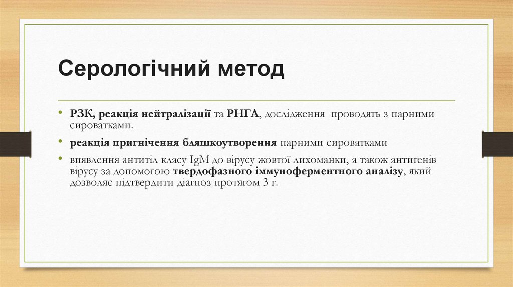 Серологічний метод• РЗК, реакція нейтралізації та РНГА, дослідження проводять з парними