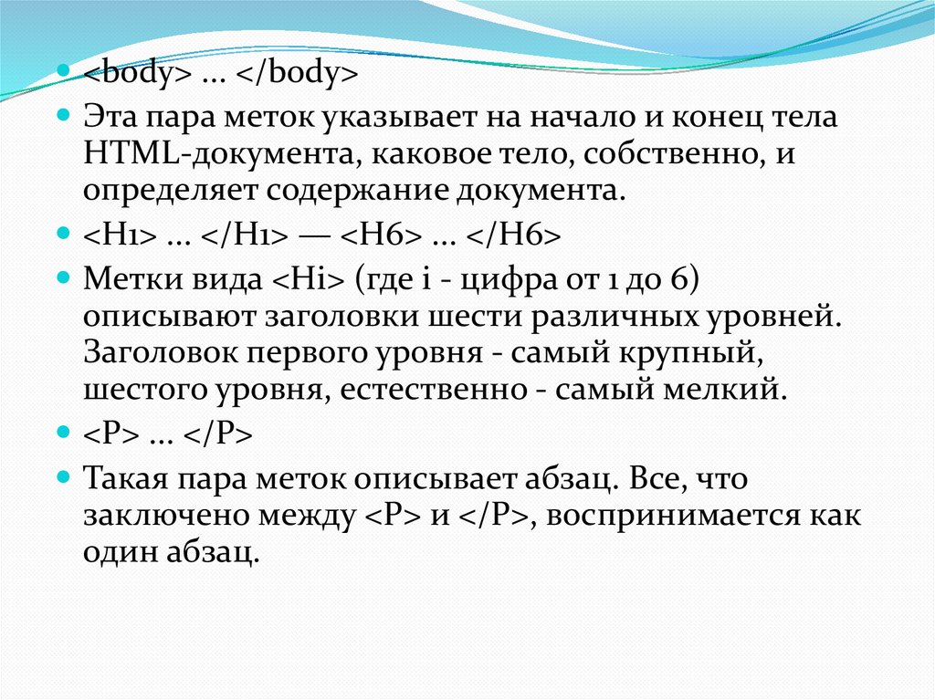 <body> ... </body>Эта пара меток указывает на начало и конец тела