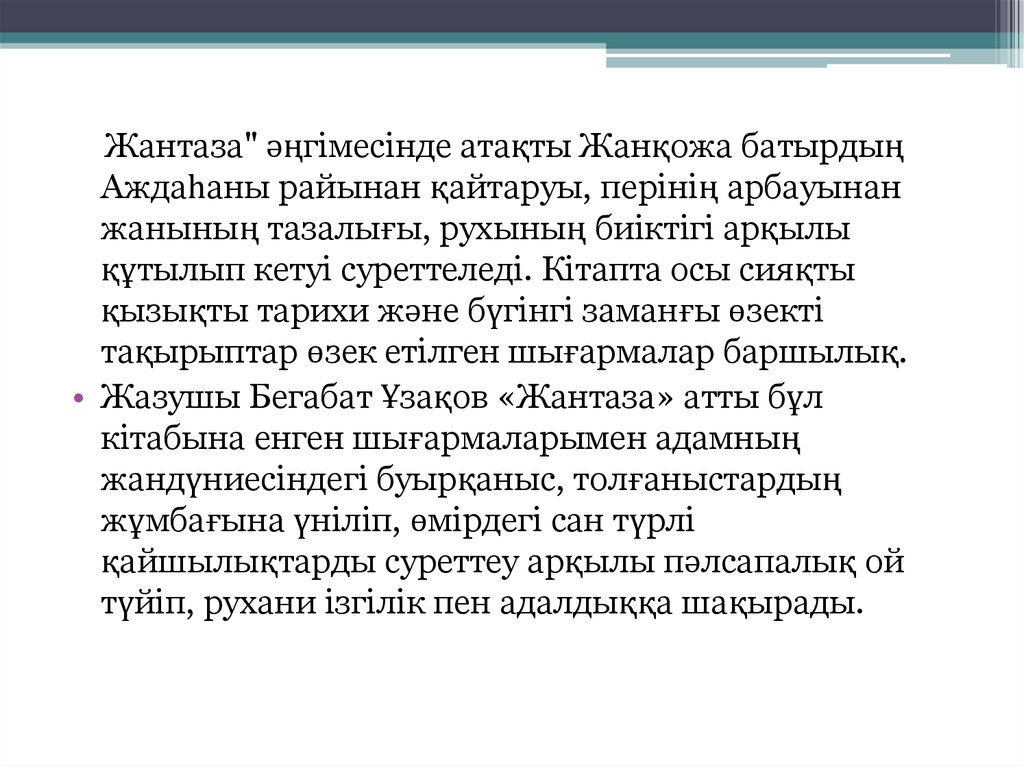 • Жазушы Бегабат Ұзақов «Жантаза» атты бұл