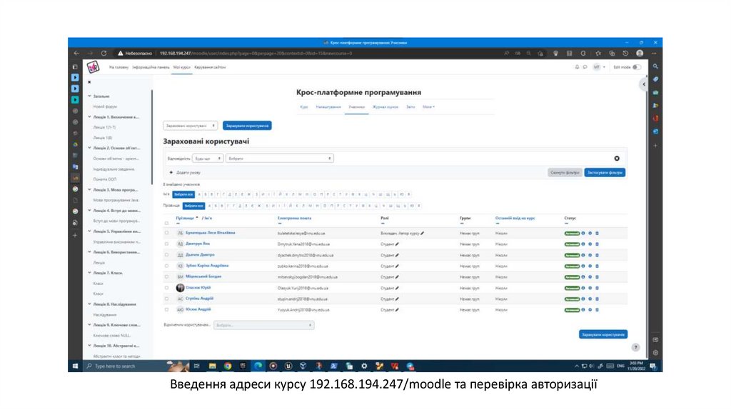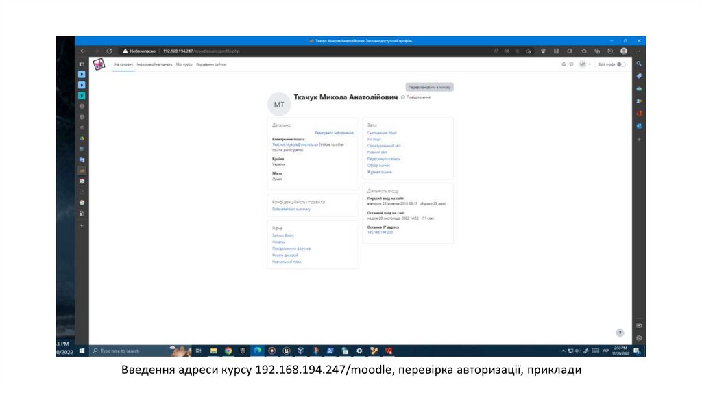 Введення адреси курсу 192.168.194.247/moodle та перевірка авторизації