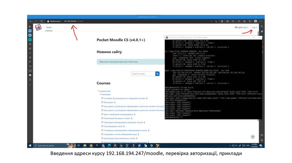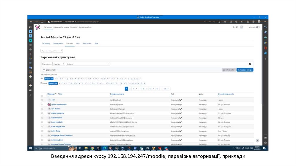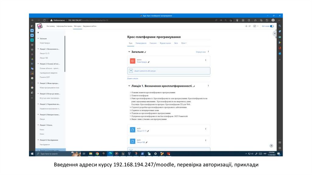 Введення адреси курсу 192.168.194.247/moodle, перевірка авторизації, приклади
