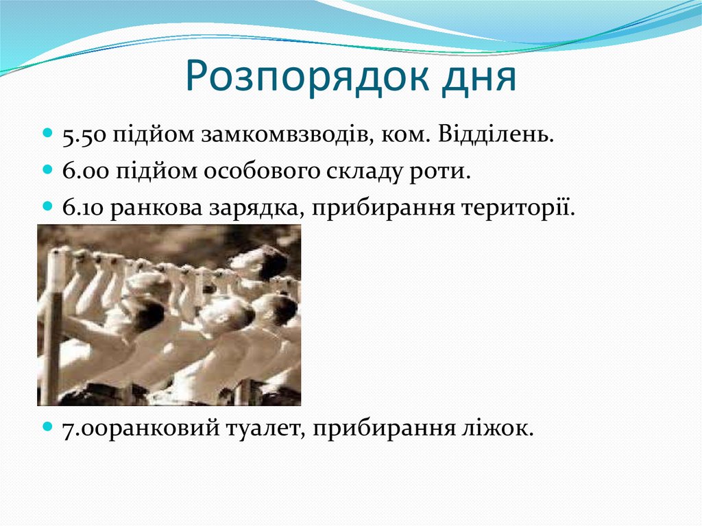 Розпорядок дня5.50 підйом замкомвзводів, ком. Відділень.