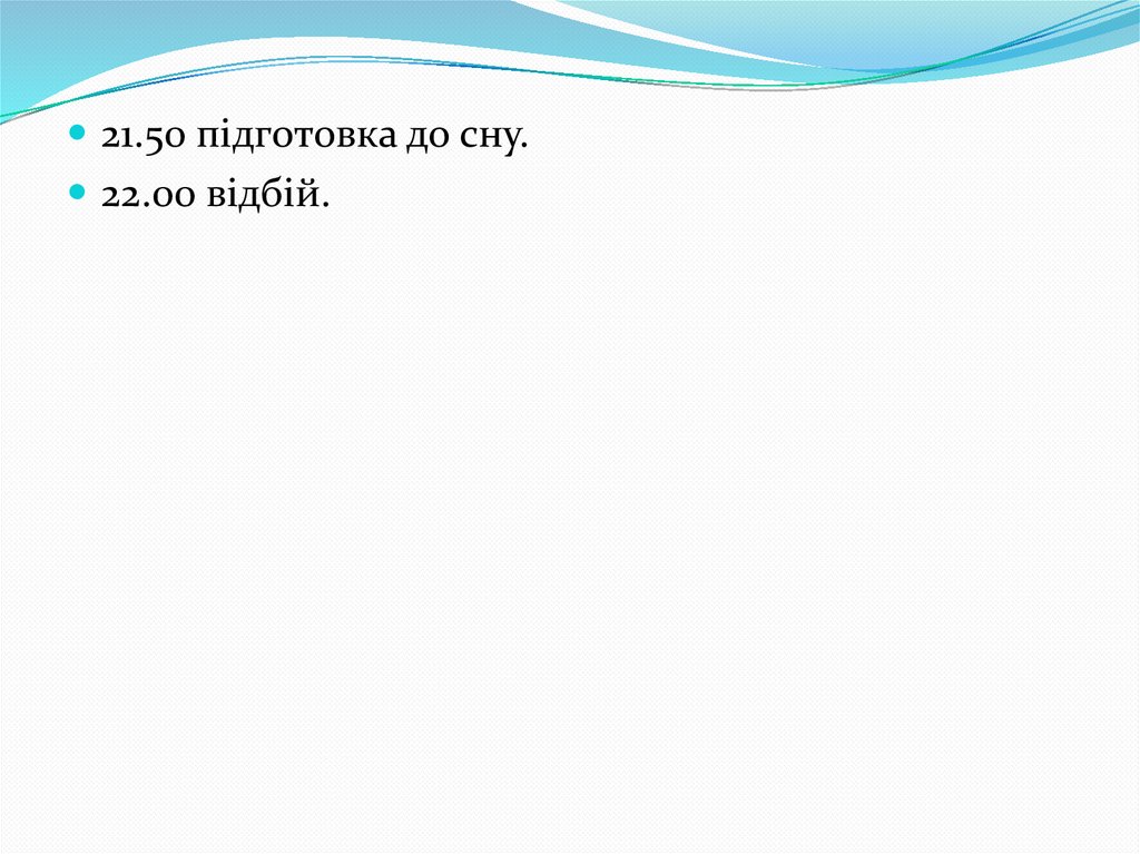 21.00 Перегляд телепередач.21.30 Вечірня прогуляка.