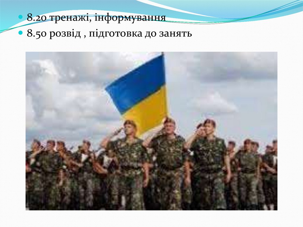 8.20 тренажі, інформування8.50 розвід , підготовка до занять