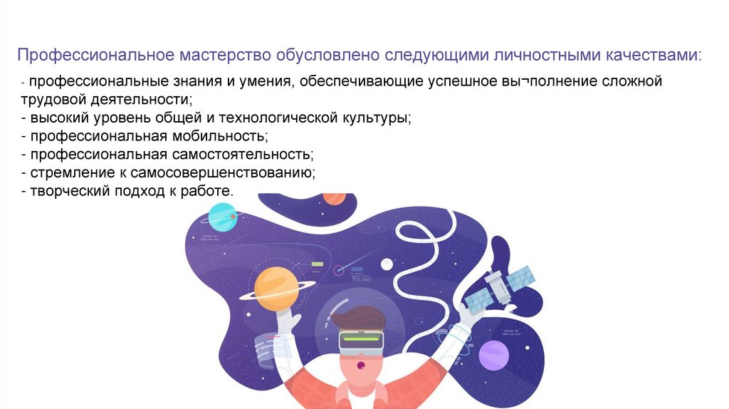 Профессиональное мастерство обусловлено следующими личностными качествами:- профессиональные знания и умения, обеспечивающие успешное вы¬полнение сложной