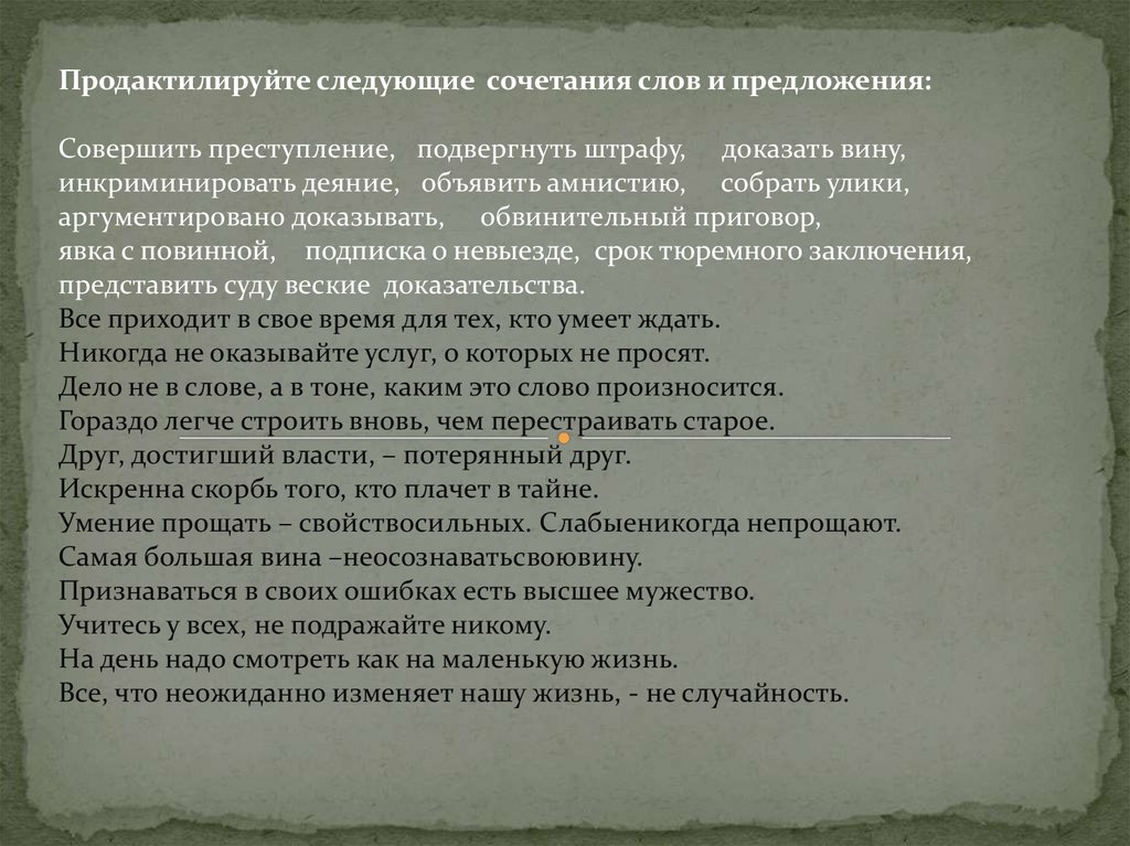 Продактилируйте следующие сочетания слов и предложения:Совершить преступление, подвергнуть штрафу, доказать вину,