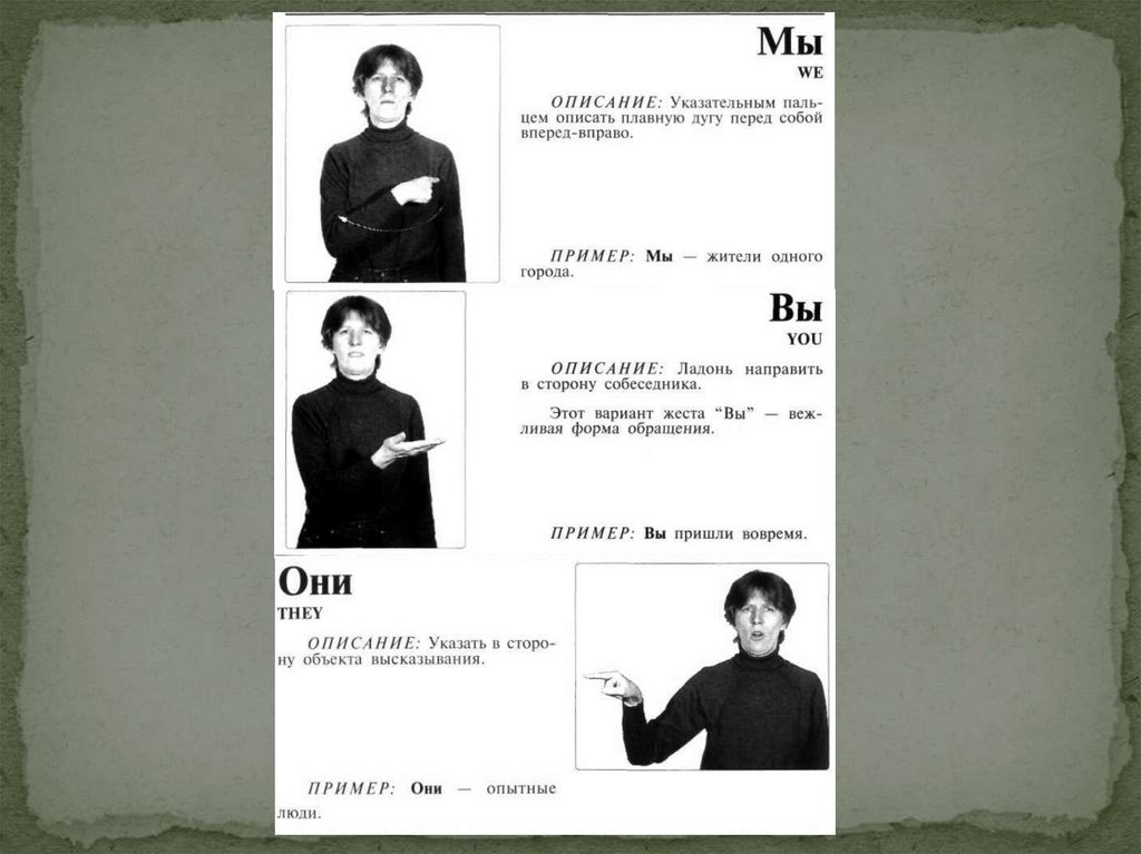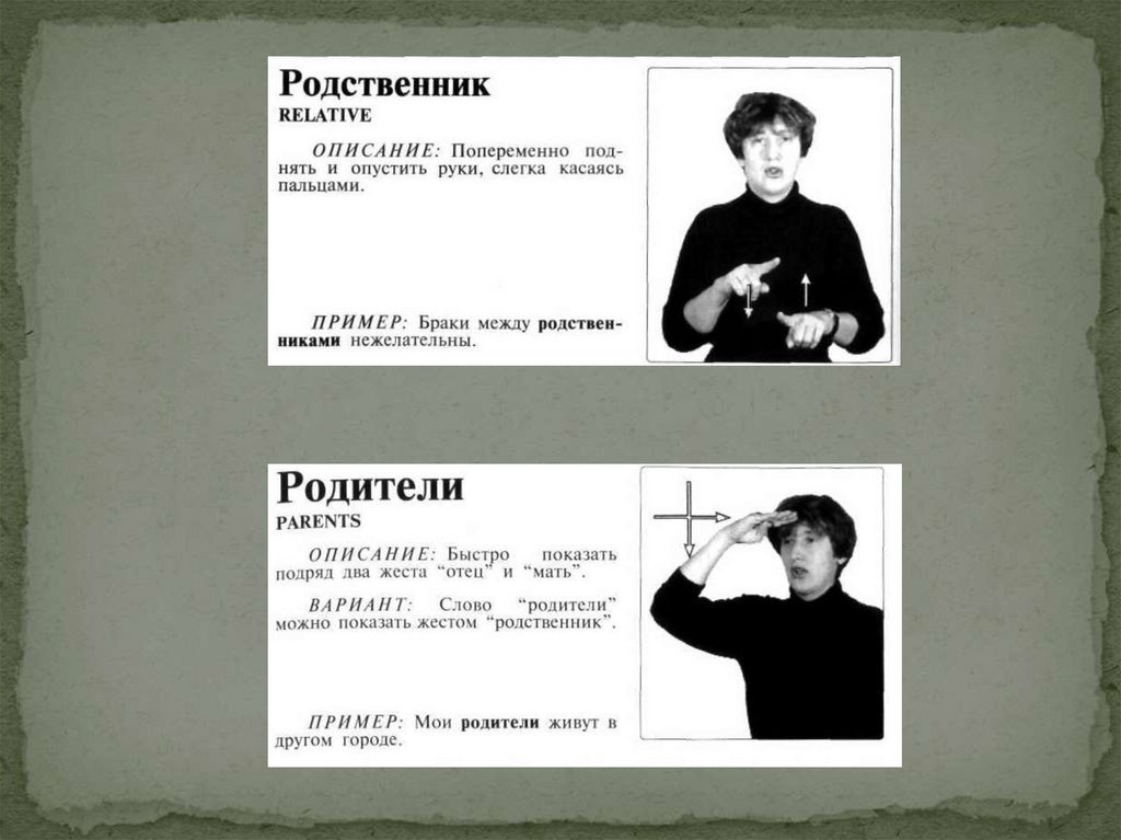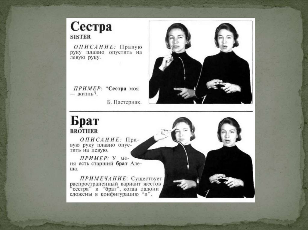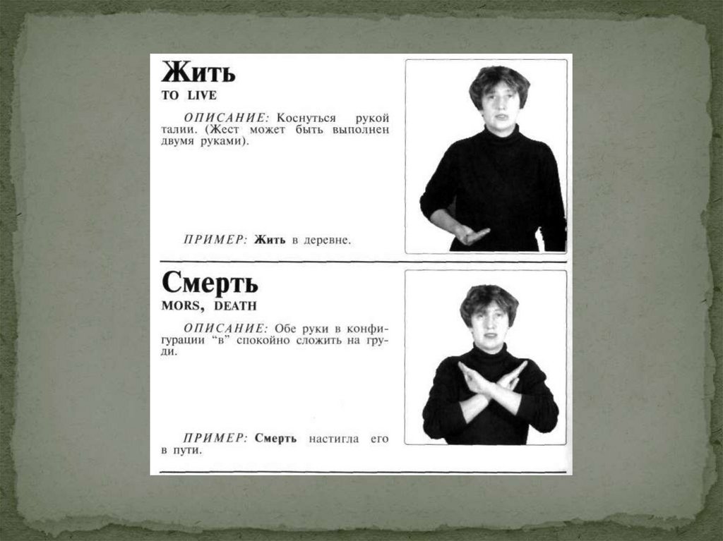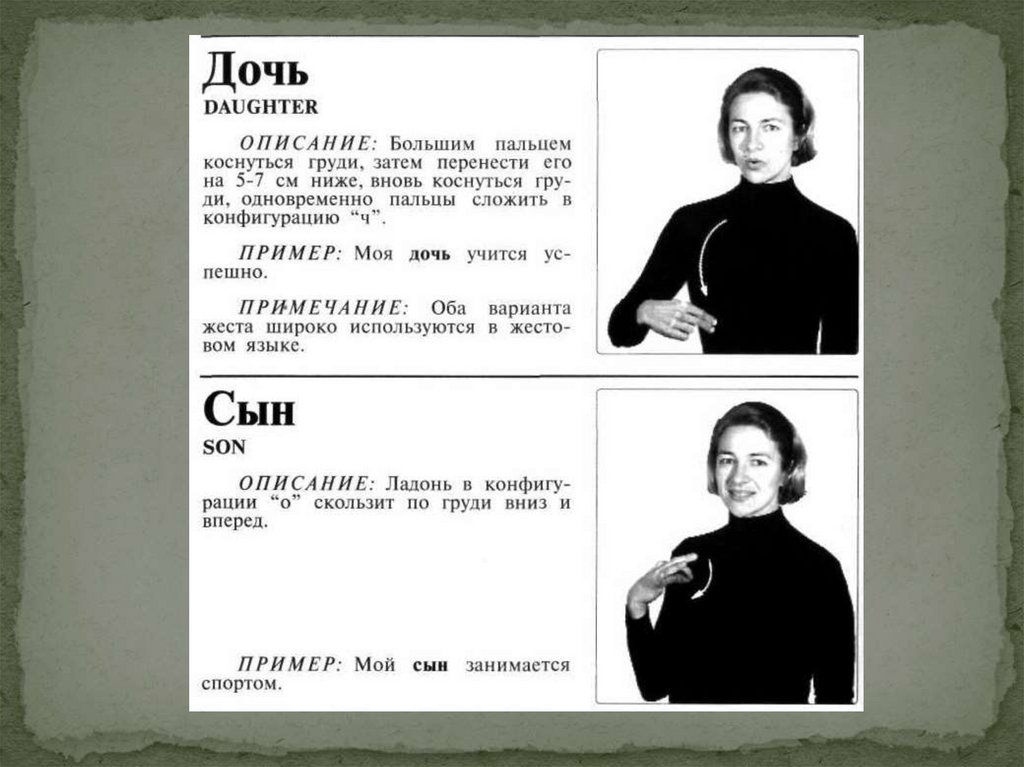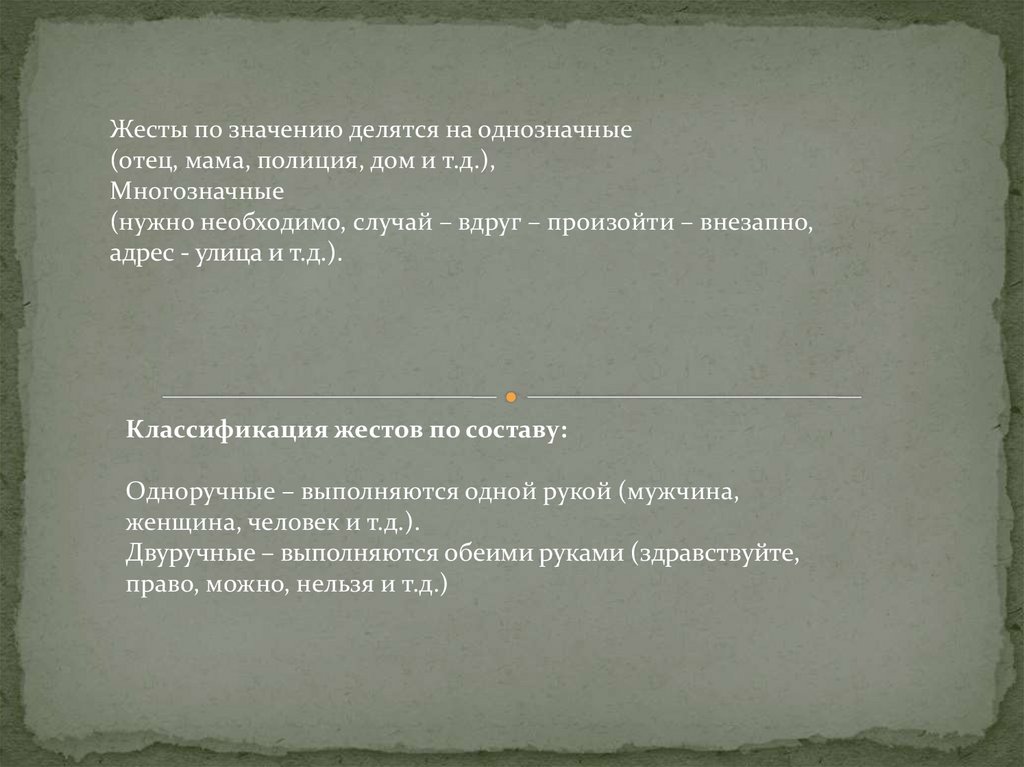 Жесты по значению делятся на однозначные(отец, мама, полиция, дом и т.д.),
