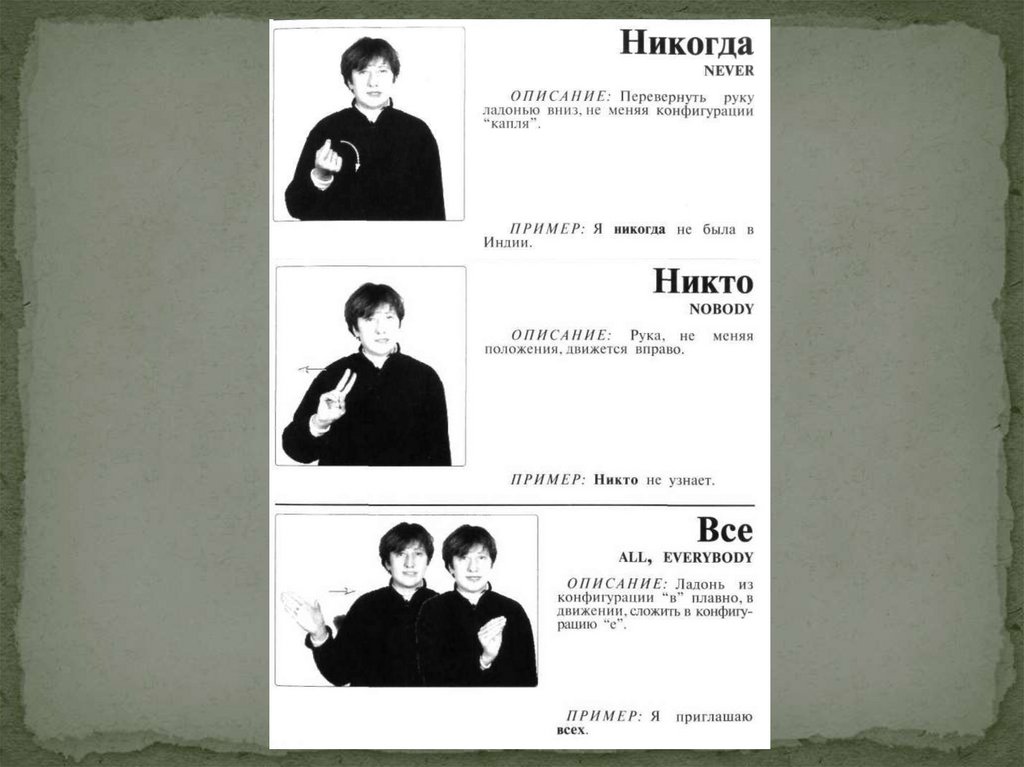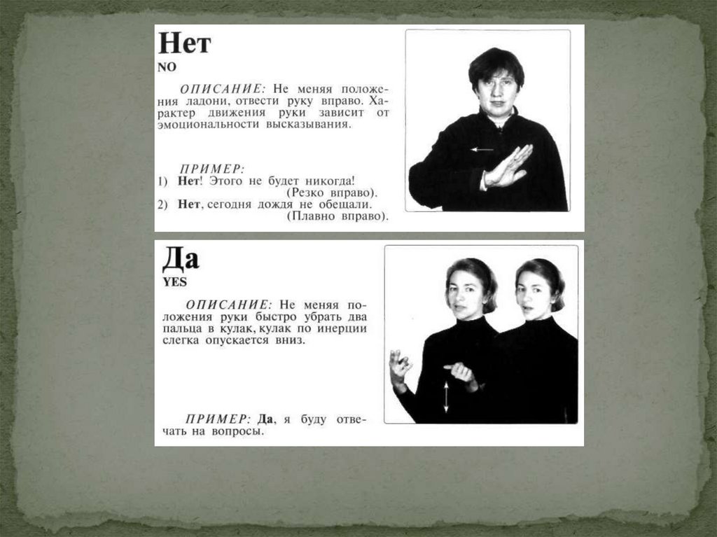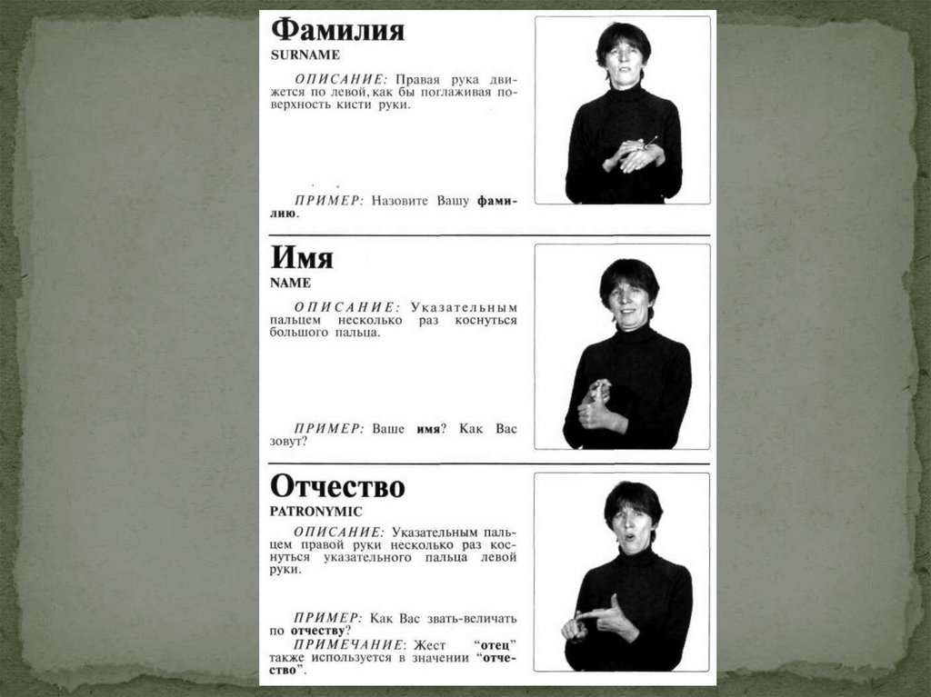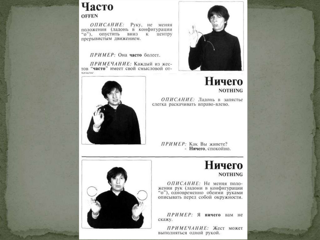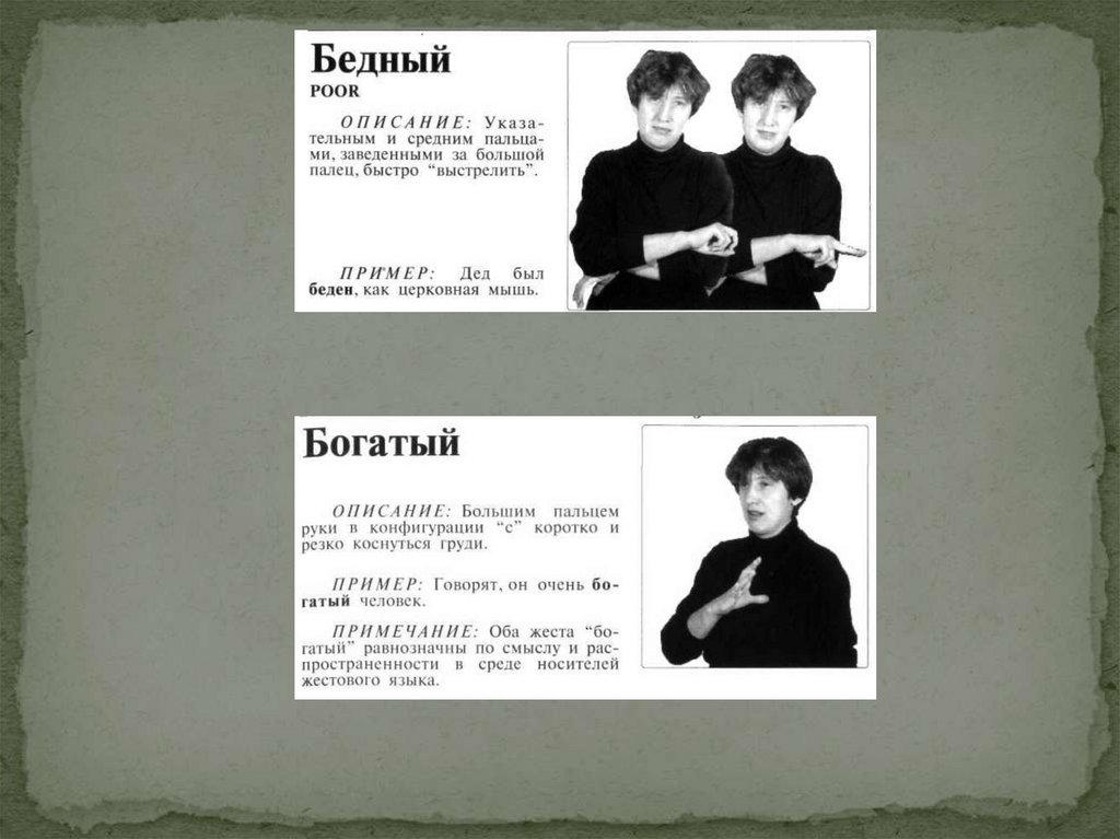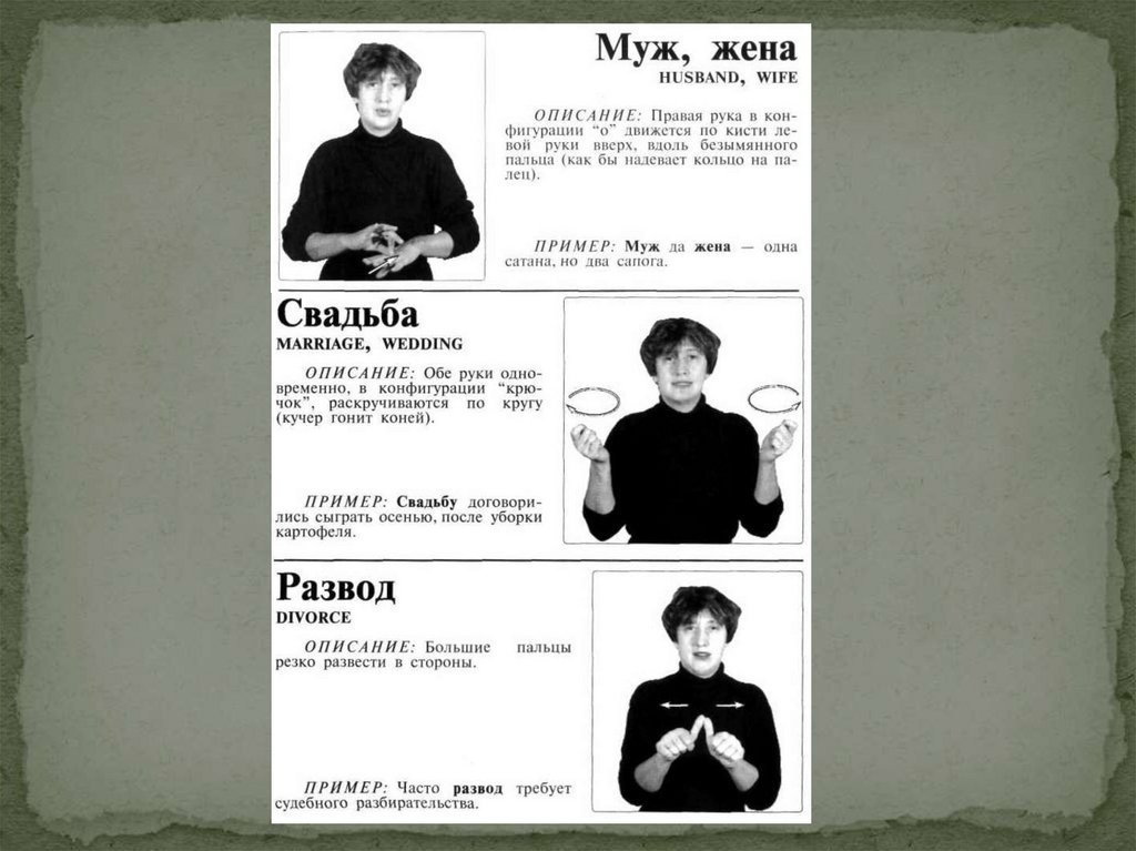 Жесты по значению делятся на однозначные(отец, мама, полиция, дом и т.д.),