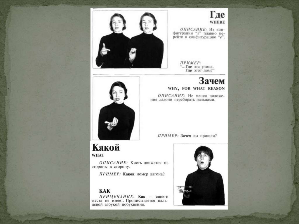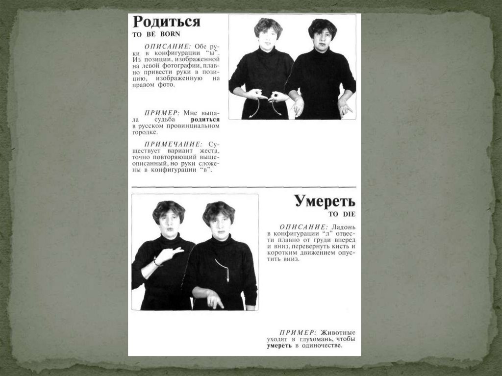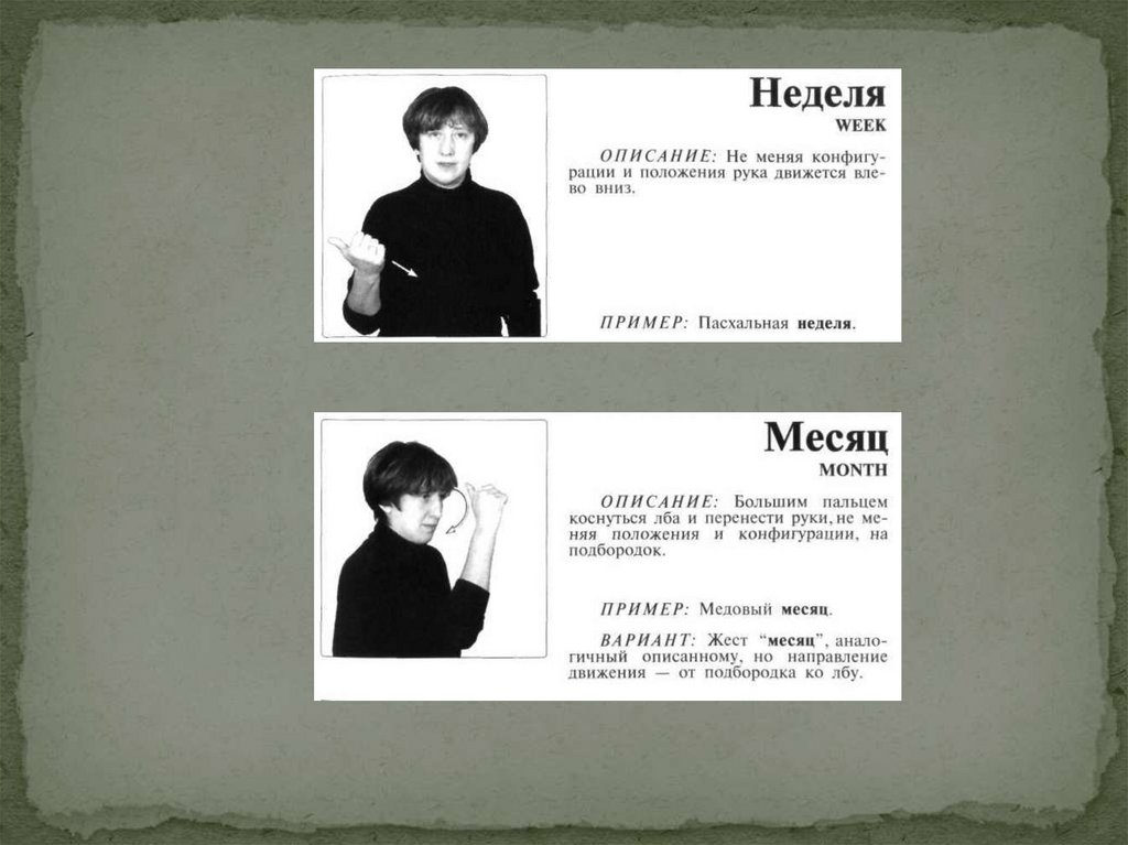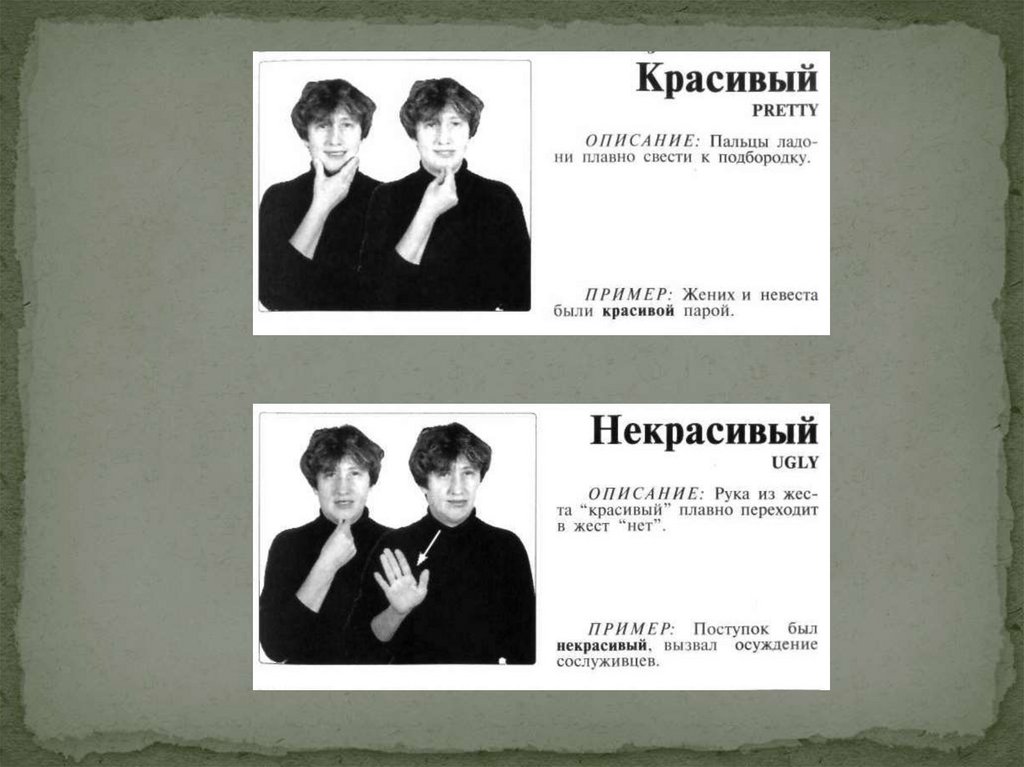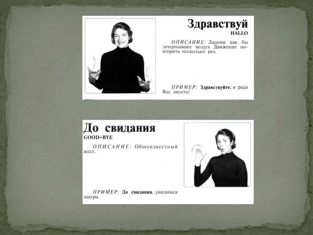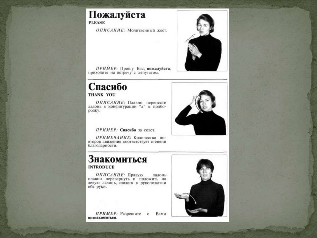 Жесты по значению делятся на однозначные(отец, мама, полиция, дом и т.д.),