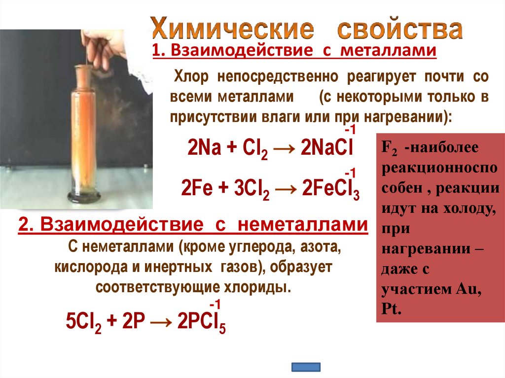 1. Взаимодействие с металламиХлор непосредственно реагирует почти со