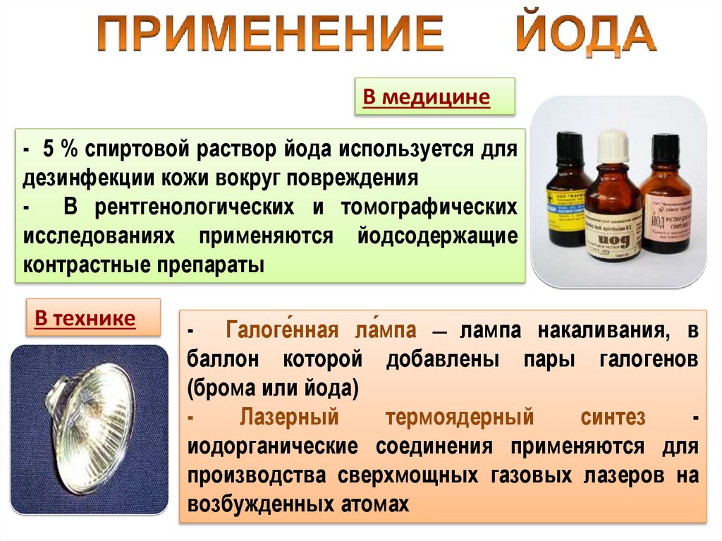 В медицине- 5 % спиртовой раствор йода используется для