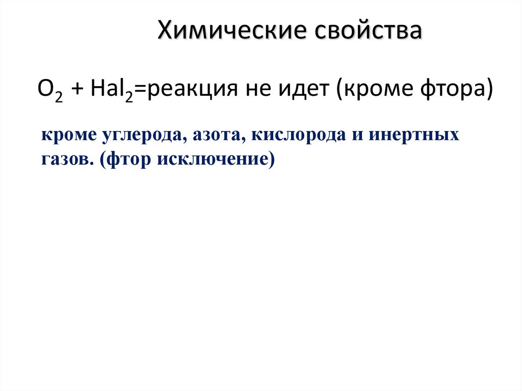 O2 + Hal2=реакция не идет (кроме фтора)кроме углерода, азота, кислорода и инертных