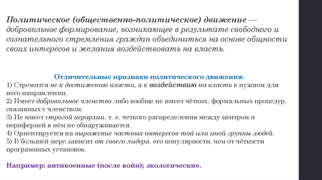 Отличительные признаки политического движения: